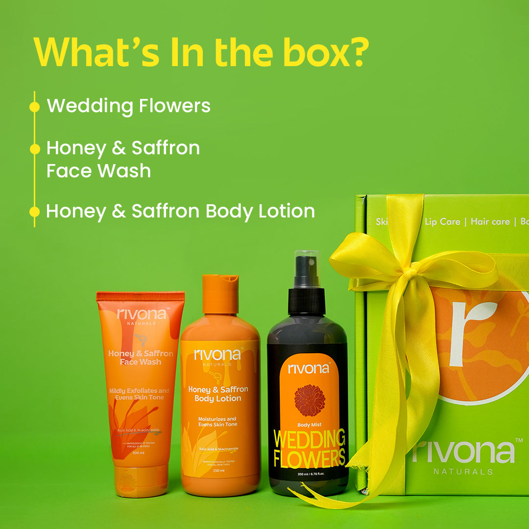 Rivona Wedding Glow Care Kit is your go-to for everyday selfcare. Packed with natural ingredients, it includes all the basics for a simple, effective routine that cleanses, hydrates, nourishes and keep you smelling good all day. Perfect for gifting on any occasion.